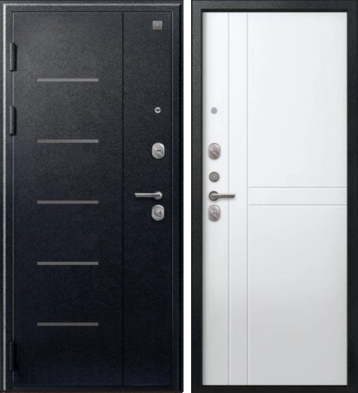 Надежная входная Дверь V-06 Черный муар - Белый премиум класса по цене 39 401 руб. Большая толщина стали защитит от проникновения в ваш дом, квартиру или коттедж. Используется очень качественная фурнитура: замки, цилиндры, ручки, защелки. Покрытие и отделка двери изготовлено под внимательным контролем производителя. Дверь имеет долгий срок службы и гарантию.
